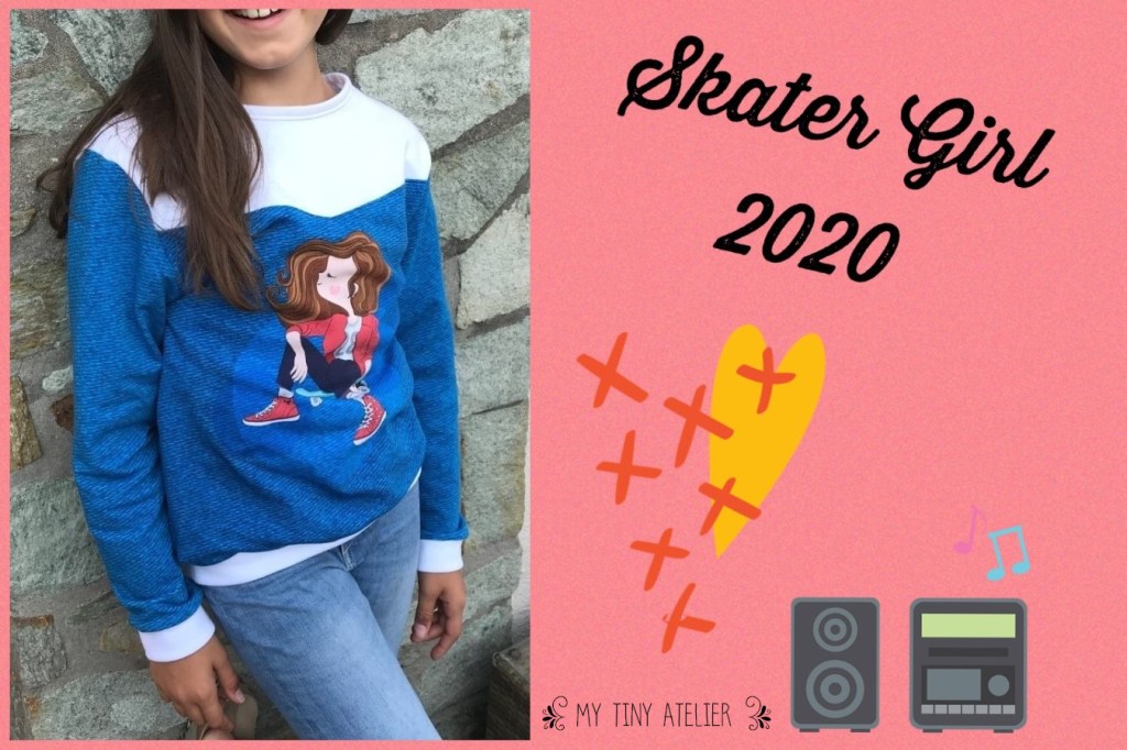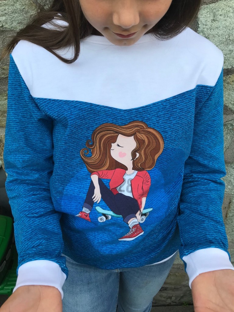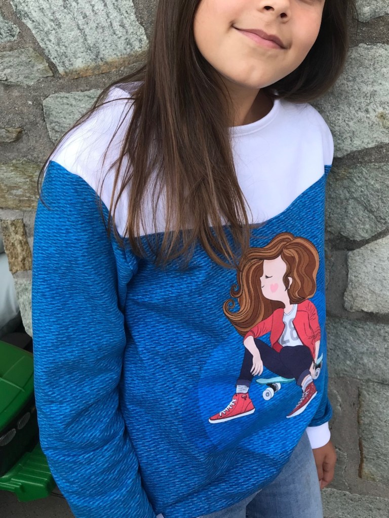 It was the design of a little skateboarder with long hair and I immediately imagined the sweater I could make for Elea. I think that’s what made me win. Indeed, I had to say that I would do with this fabric and I explained that I would make a sweatshirt for my daughter because there are a lot of panels for the little ones but not many for the older ones.