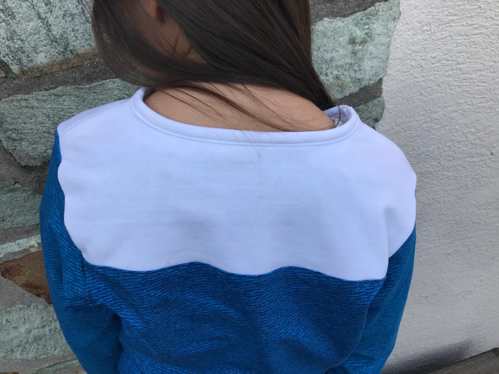 Quand j´ai reçu le panneau, accompagné d´un coupon uni, je me suis rendue compte que ces derniers ne faisaient pas plus de 50cm de hauteur. Mais comme je devais confectionner le sweatshirt en 152cm, c´était un peu juste… Du coup j ai ressorti un tissu sweat d´été blanc pour ajouter une pièce eu devant et dos. Pour le bas des manches et du pull, j avais tout pile ce qu´il fallait en bord côte blanc! 😮💨