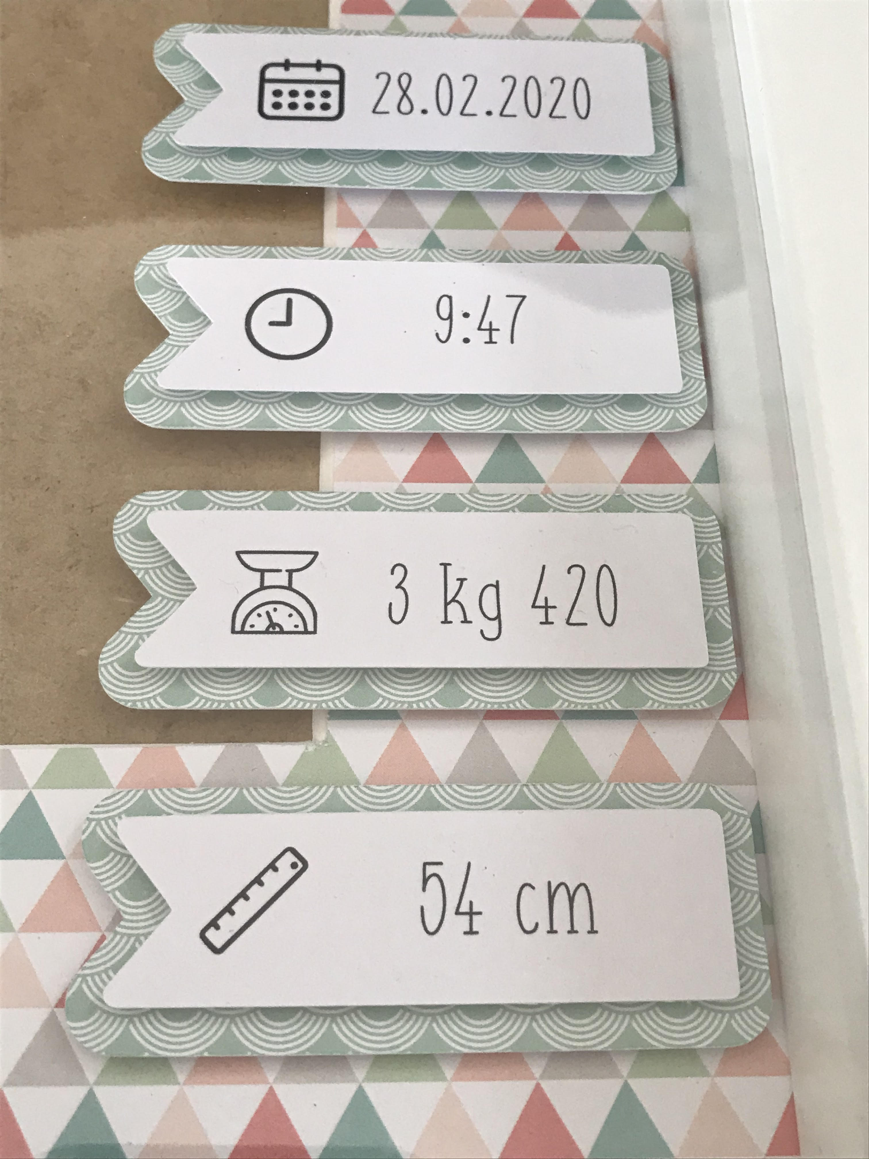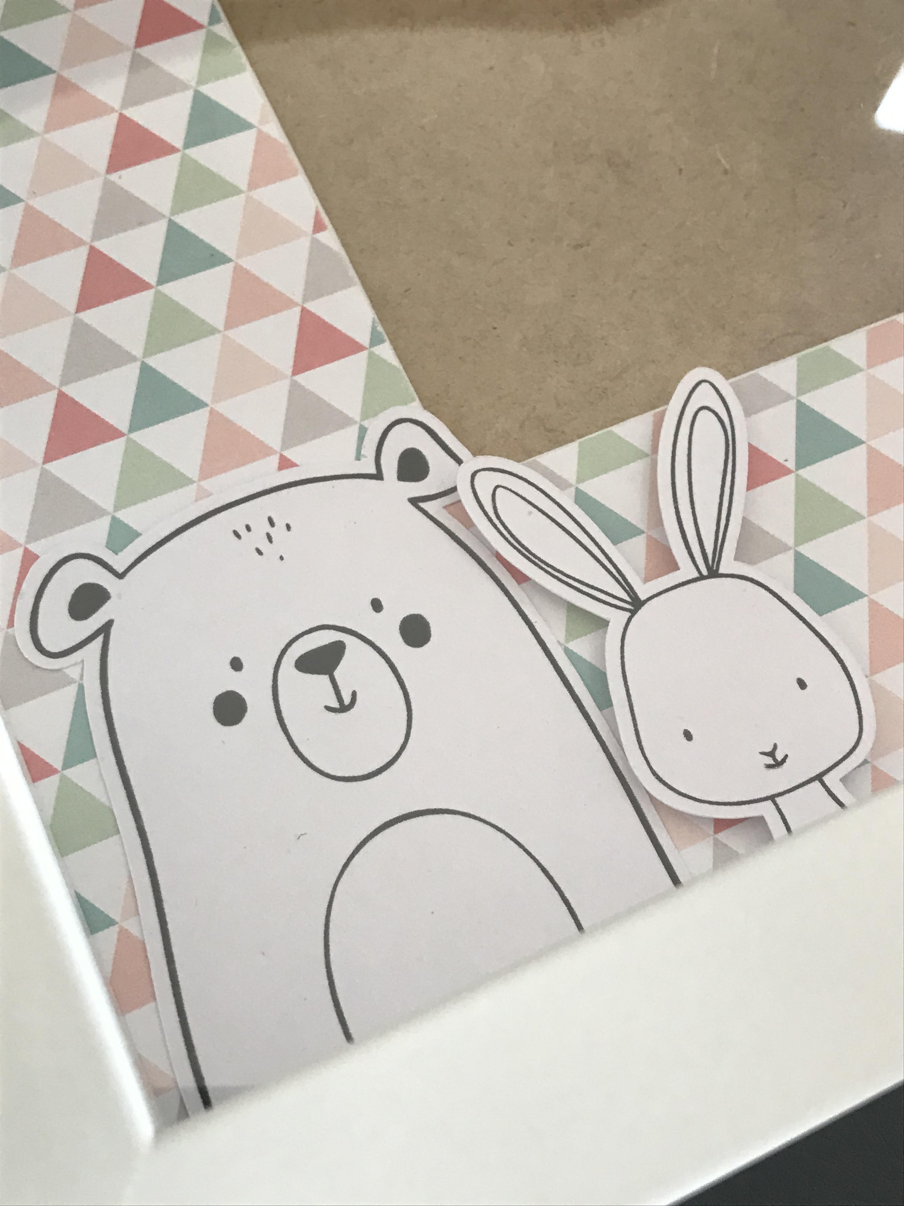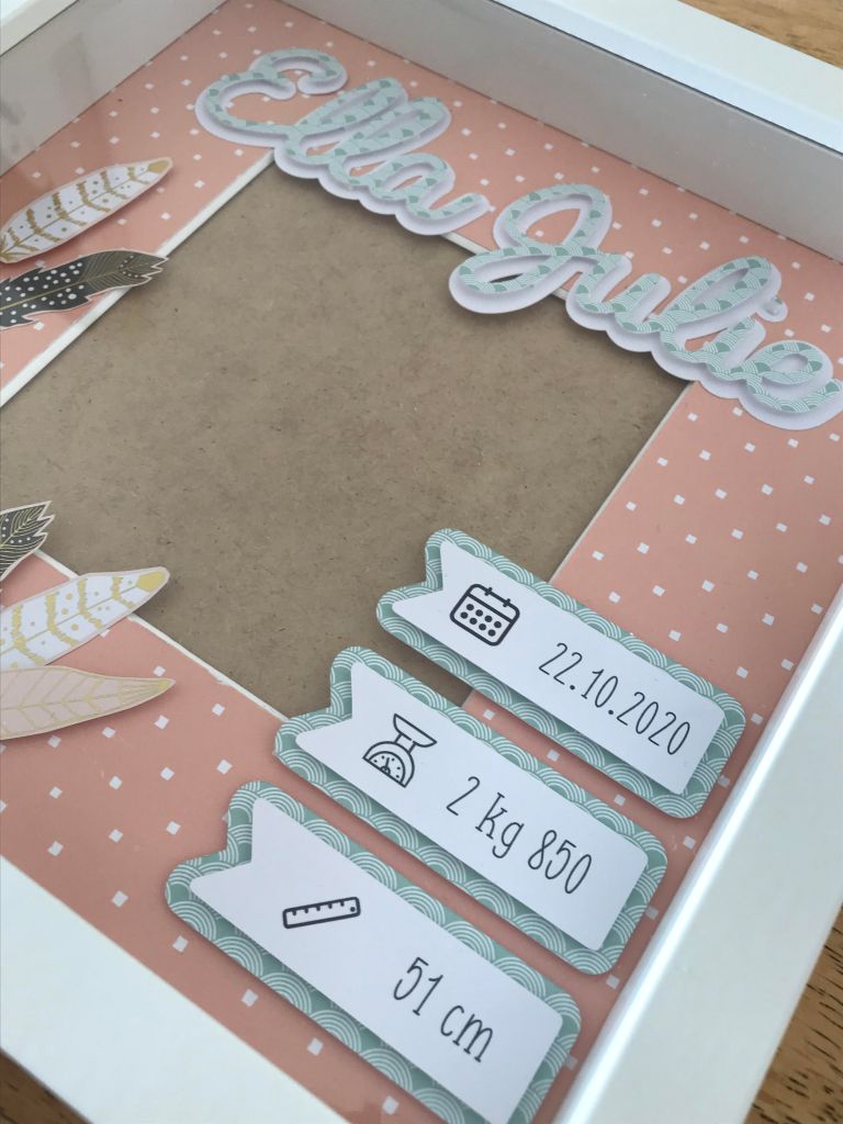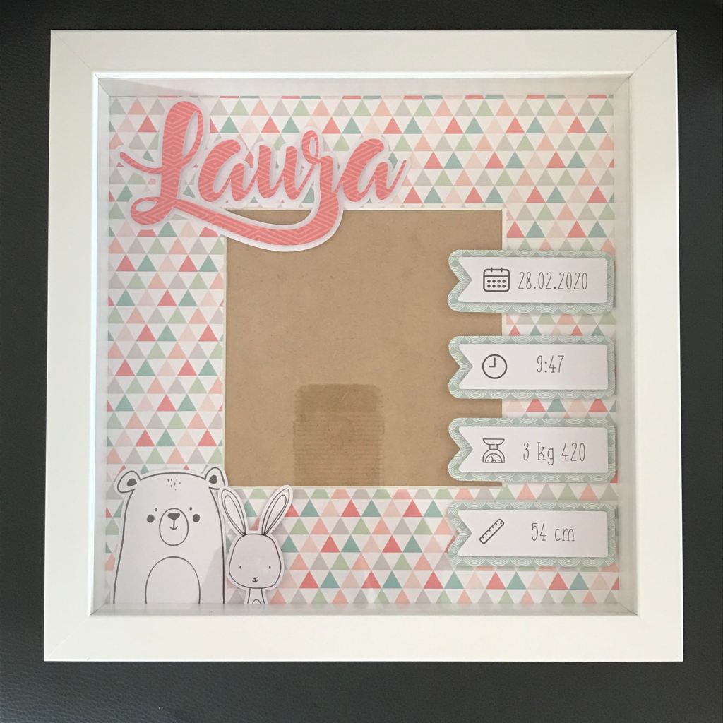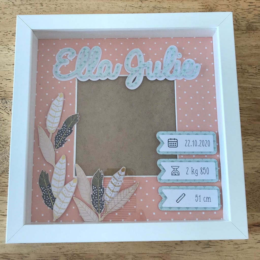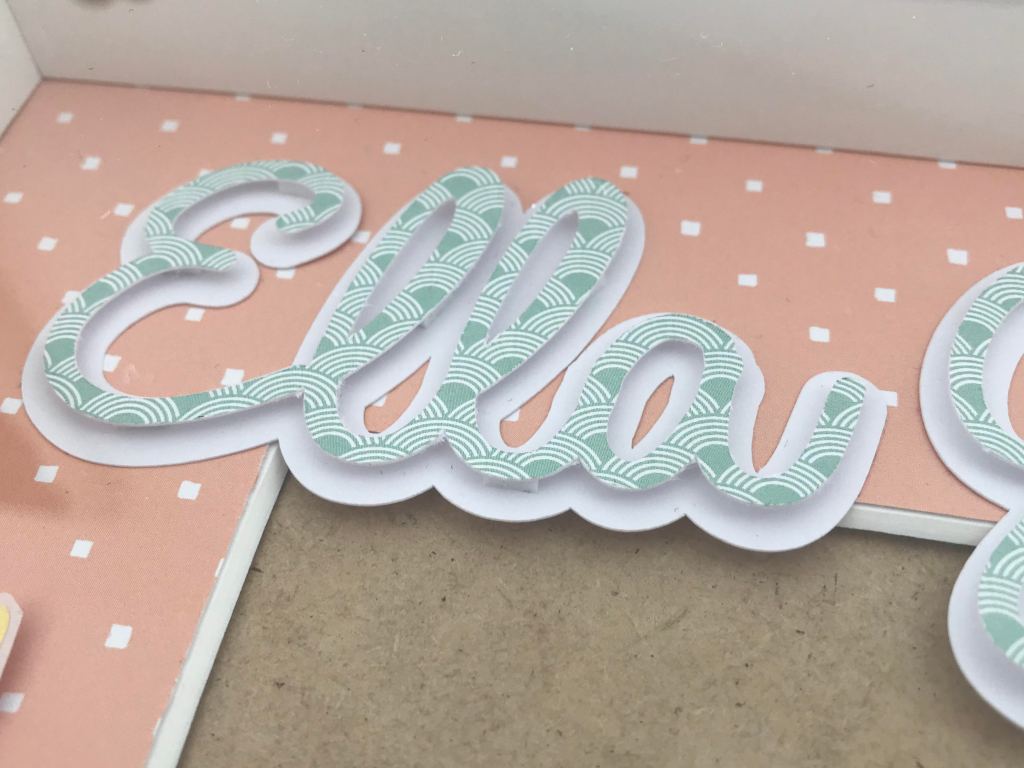It’s been a few weeks (uh… ok I should say “months” now – haha!) I’ve had 2 orders. A frame for a little Laura and another one for a little Ella Julie. What I like most is to look for papers that work well together without being too busy and that stay fresh, cute and in nice colors. I can’t tell you how many blocks I have at home! 🙈 (yes that’s it, just like fabrics! You’re getting to know me ;))