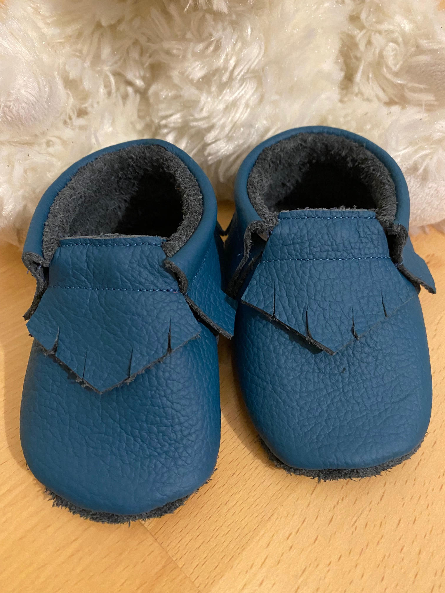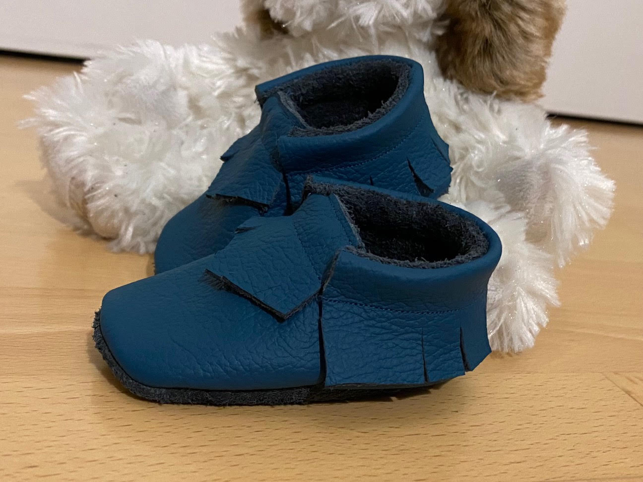 Pour la semelle, j ai utilisé le même cuir mais sur l´envers pour qu´ils ne glissent pas et pour la couleur, j´ai choisi un bleu petrol (ou canard?🤔) parce que je voulais sortir des stéréotypes bleu pour les garcons et rose pour les filles. 😉